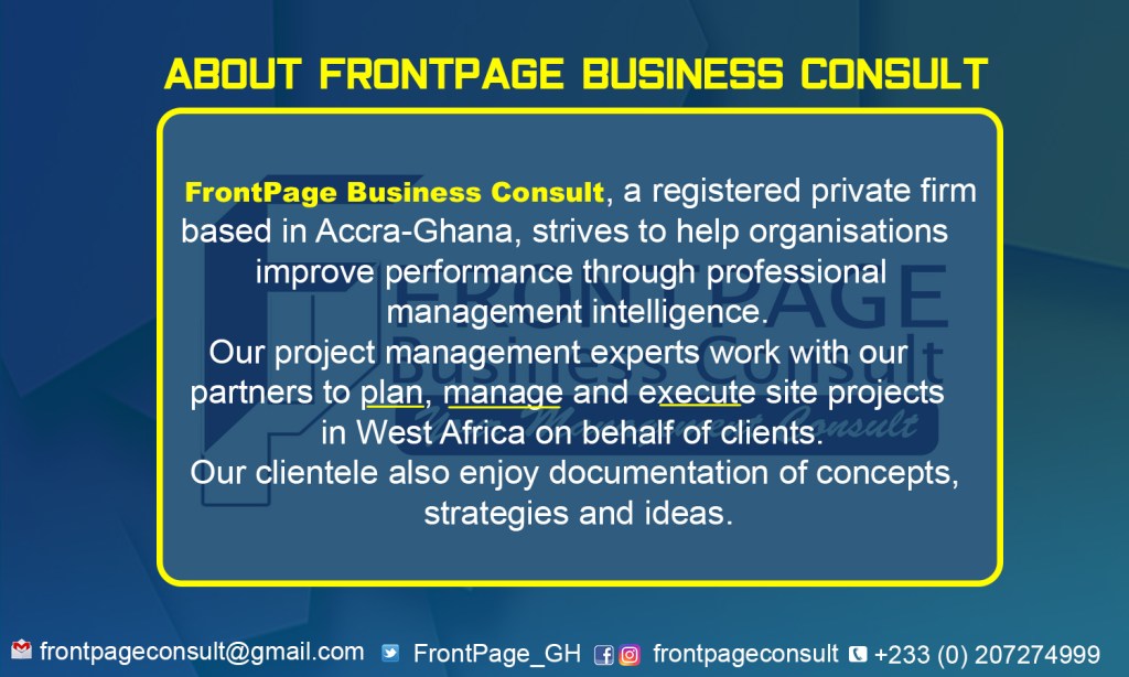 FrontPage Consult is a registered private firm based in Accra-Ghana, with apt project management team that works closely with you to plan, manage and execute site projects. Our clientele also enjoy related documentation of concepts, strategies and ideas.